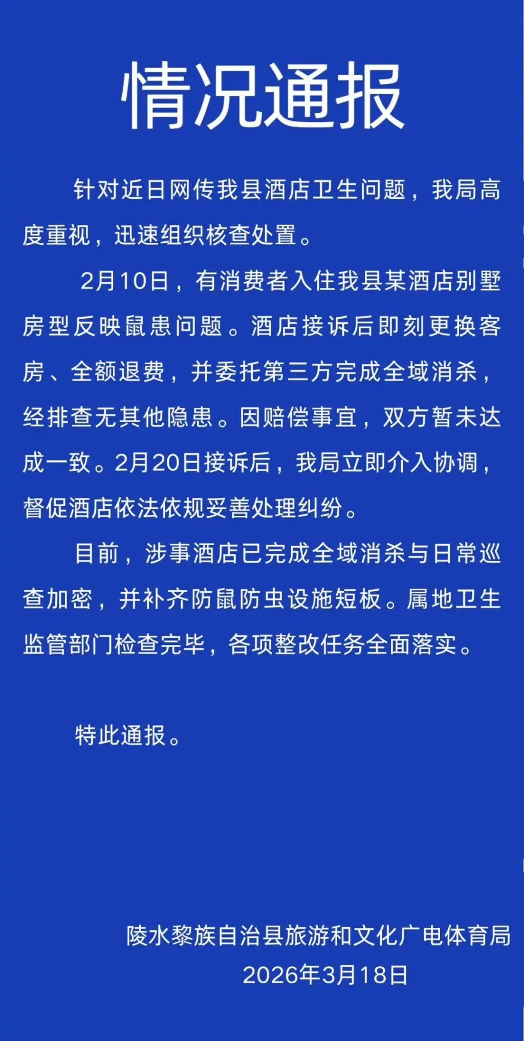 3月18日,海南陵水黎族自治县旅游和文化广电体育局发布情况通报: